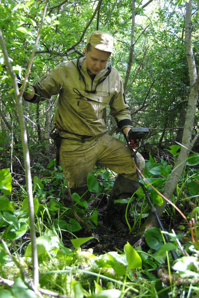 Погода в этой экспедиции нас радовала, но не баловала. Кратковременные дожди, длившиеся по несколько часов, потребовали волевых и моральных усилий от каждого участника поиска. В первую неделю экспедиции были обследованы старые, хорошо известные нам места, где в 2013 – 2014 годах мы проводили масштабные поисковые работы. Здесь удалось обнаружить останки 5 погибших военнослужащих РККА. Одновременно с этим проводились разведки на высотах и прилегающих к ним низинах болота Горохового. 3 июля удалось «зацепиться» за одну из таких болотистых низин. Сюда немедленно были переброшены основные силы отряда. На площади 120 × 40 м развернулась упорная работа по поиску погибших солдат. Нам удалось установить, что здесь в марте – апреле 1943 года вела наступление 64-я гв. стрелковая дивизия.